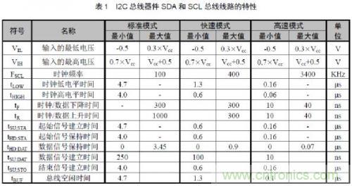 l總線電平:即輸入電壓Vcc,一般的I2C輸入電壓為3.30V,若為其他輸入電壓值也可通過旋鈕A對其進(jìn)行調(diào)節(jié)??偩€電平Vcc的調(diào)節(jié)將會(huì)影響VIL和VIH 的值,Vcc與VIL 、VIH存在如表2所示的關(guān)系。