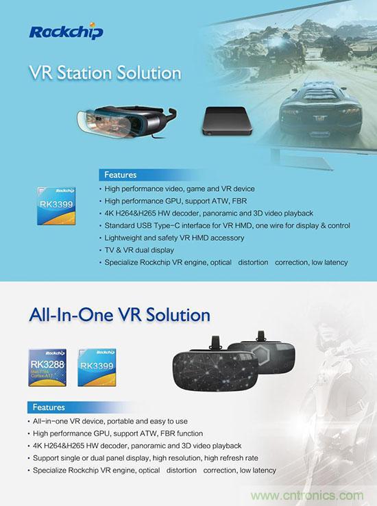 【導(dǎo)讀】本屆CES2017大展中VR全球產(chǎn)業(yè)熱度不減不增,全球硬件、平臺和內(nèi)容廠商蜂擁而至,Intel、NVIDIA、Qualcomm芯片商以及HTC、Oculus、SONY、三星、華為設(shè)備商均發(fā)布極具看點(diǎn)的新技術(shù)與旗艦機(jī)型。瑞芯微Rockchip本次展示了VR設(shè)備方案集群,方案從播放終端拓展至攝錄領(lǐng)域,成為VR新看點(diǎn)。