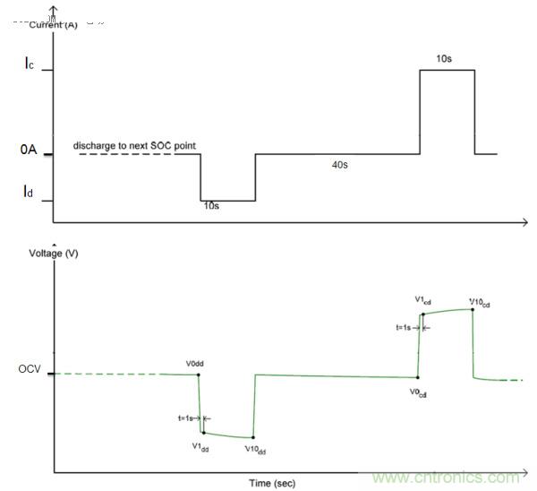 重復(fù)第二步和第三步,從而可測(cè)得90%至10%SOC共9個(gè)點(diǎn)的功率特性。在實(shí)際試驗(yàn)中脈沖電流一般根據(jù)被測(cè)電池特性決定(一般采用電池廠商提供的最大充放電倍率),SOC目標(biāo)點(diǎn)可以根據(jù)具體需要調(diào)整。