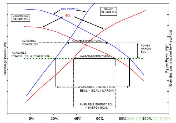 同時(shí)電池企業(yè)用以評(píng)估電池壽命終結(jié)的方法(容量衰減至BOL時(shí)的80%以下或內(nèi)阻增加50%以上)是比較籠統(tǒng)的。作為整車廠可以根據(jù)實(shí)際性能需求進(jìn)行更準(zhǔn)確的EOL確認(rèn)。下圖以一款混合動(dòng)力車型電池壽命分析為例:兩條藍(lán)線分別是BOL時(shí)刻的充放電功率特性,綠色虛線為整車實(shí)際需求工況。則在BOL狀態(tài)下電池在20%~90%SOC區(qū)間內(nèi)都滿足整車功率需求,在可用能量上有一定的富裕。隨著電池性能的衰減,兩條紅線代表了功率性能的下降,其可用SOC區(qū)間為40%~75%,到達(dá)EOL零界點(diǎn)。一旦繼續(xù)衰減可用容量就無法滿足整車需求。