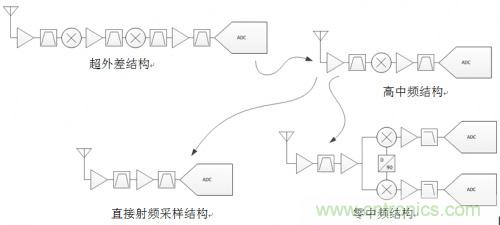 十年前,大多數(shù)無線電設備建立在較為基礎的超外差結構上,且具有多個下變頻級。當時,我們見證了高 IF (中頻) 結構中出現(xiàn)單個下變頻級的變化。這得益于ADC帶寬、采樣速率與性能等的顯著改善,這些顯著的改善使第二或第三奈奎斯特區(qū)域的信號采樣得以實現(xiàn)。ADS62P45 ADC便是引領這次變化的一個典型代表?,F(xiàn)在,ADC技術進一步得到改進與提升,使得無線電中最后一個下變頻級也得以消除,從而支持直接射頻(RF)采樣接收機。參見圖1。