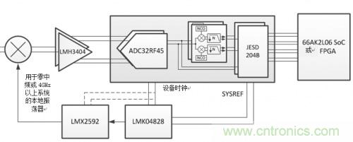在射頻采樣無線電中,采樣時鐘的質(zhì)量好壞對系統(tǒng)產(chǎn)生的信噪比(SNR)具有強烈影響。LMK04828是兼容JESD204B的超低噪音時鐘抖動清除器,可生成小于100fs抖動、具有射頻采樣能力的時鐘,同時具有一系列收縮或簡化系統(tǒng)的特性。因支持最多七個JESD204B裝置,LMK04828可以為多個ADC32RF45 ADC、數(shù)字模擬轉換器(DAC)、FPGA或DSP記時。LMK04828還可以生成系統(tǒng)參考(SYSREF)信號,用于JESD204B系統(tǒng)中確定性延遲,而數(shù)字和模擬延遲可幫助滿足每個JESD204B設備的關鍵計時需求。