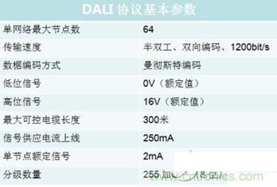 DALI數(shù)字式可尋址燈光接口(Digital Addressable LighTIng Interface)鎮(zhèn)流器是當(dāng)前最新的可調(diào)光熒光燈鎮(zhèn)流器。DALI是一個數(shù)據(jù)傳輸?shù)膮f(xié)議,它定義了電子鎮(zhèn)流器與設(shè)備控制器之間的通信方式,基于DALI 協(xié)議組建的系統(tǒng)具有分布式智能模塊, 各個智能化DALI 模塊都具有數(shù)字控制和數(shù)字通信能力, 地址和燈光場景信息等都存儲于各個DALI 模塊的存儲器內(nèi)。DALI 模塊通過DALI 總線進(jìn)行數(shù)字通信、傳遞指令和狀態(tài)信息,實現(xiàn)燈的開關(guān)、調(diào)光控制、系統(tǒng)的設(shè)置等功能。DALI總線制定一個系統(tǒng)結(jié)構(gòu)簡單、安裝方便、操作容易、功能良優(yōu)的燈光控制系統(tǒng),可用于一個房間內(nèi)的燈光控制,還可以連接更高級的設(shè)備網(wǎng)絡(luò),如以太網(wǎng),以支持更多的設(shè)備和足夠的網(wǎng)絡(luò)帶寬。 DALI協(xié)議的基本參數(shù)如下: