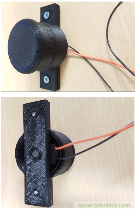 我們正在開(kāi)發(fā)的一款參考設(shè)計(jì)將電容觸摸集成到旋鈕設(shè)計(jì)中,組成了觸覺(jué)旋鈕的反饋回路。旋鈕將保持靜止,但是當(dāng)使用者手指在旋鈕周?chē)瑒?dòng)時(shí),螺線(xiàn)管將啟動(dòng),產(chǎn)生明確的咔嗒感。這種反饋會(huì)讓人感覺(jué)它在像一般的機(jī)械旋鈕一樣轉(zhuǎn)動(dòng)。圖2所示為我們的3D打印原型旋鈕的頂視圖和底視圖。