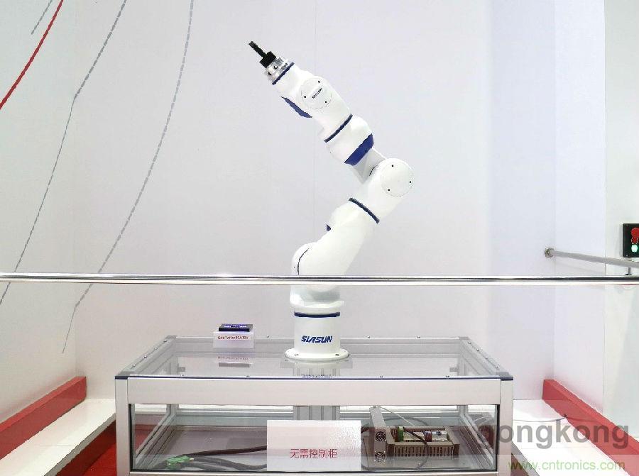 現(xiàn)場,內(nèi)置Gold Twitter的新松七軸協(xié)作機器人華麗亮相,動作輕柔簡潔,控制柜體量小,線纜清晰明了。楊崇武先生介紹,在當(dāng)前的智能制造時代,設(shè)備越來越輕量化,埃莫的Gold Twitter系列可以放置在移動荷載上、電機上或電機內(nèi),從而提高性能、節(jié)省空間,減少電纜和幾乎不需要電氣柜。