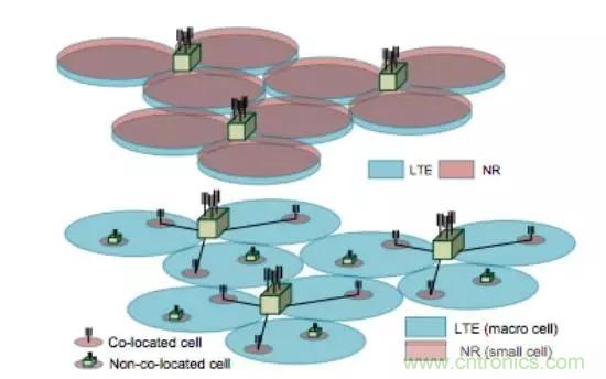 5G基站(gNB)也可作為微站,與現(xiàn)有的LTE基站(eNB)共站或非共站部署,解決室內或熱點覆蓋。