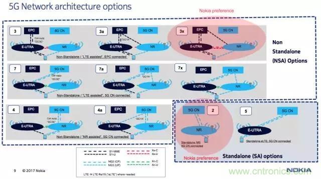 對于5G組網(wǎng),3GPP在去年釜山會議上由德國電信提出了12種組網(wǎng)選項。其中選項3/3a/3x、7/7a/7x、4/4a為非獨立組網(wǎng)構架,選項2、5為獨立組網(wǎng)構架。