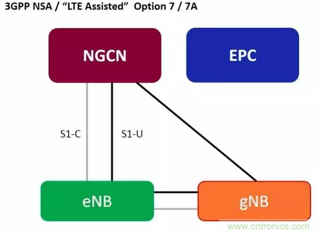 這次凍結的3GPP R15 NSA(5G NR非獨立組網(wǎng))核心標準部分內容:,即沿用4G核心網(wǎng)(EPC),以4G作為控制面的錨點,采用LTE 與 5G NR雙連接的方式,利用現(xiàn)有的LTE網(wǎng)絡部署5G,以滿足領先運營商快速實現(xiàn)5G覆蓋的需求。