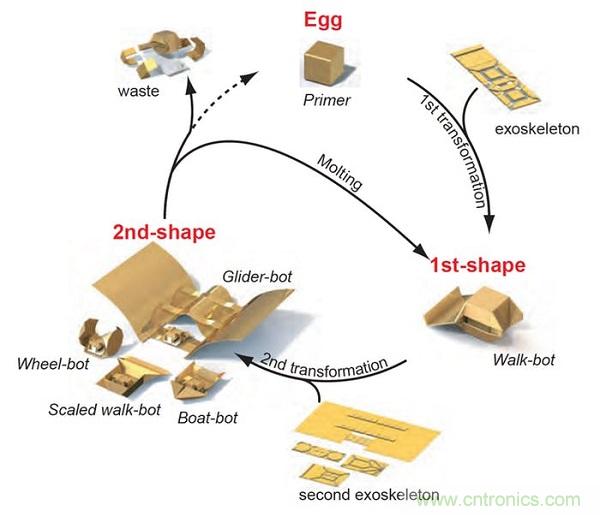 MIT開發(fā)透過磁鐵遠(yuǎn)程控制的Primer機(jī)器人,其以長方形塑料片制造的外骨骼能自行折疊成不同的形狀,為各種不同的任務(wù)客制機(jī)器人;而當(dāng)Primer完成工作后,則浸入水中溶解外骨骼…