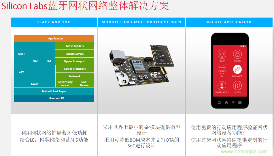 陳雄基以藍(lán)牙5的Mesh網(wǎng)絡(luò)和智能家居,尤其是智能照明中常用的ZigBee網(wǎng)絡(luò)為例,作了詳細(xì)的說(shuō)明。就在一個(gè)多月前 Silicon Labs 為其Wireless Gecko片上系統(tǒng)(SoC)和模塊產(chǎn)品組合發(fā)布了新的動(dòng)態(tài)多協(xié)議軟件,可同時(shí)在單一SoC上運(yùn)行zigbee和低功耗藍(lán)牙(Bluetooth low energy),匯集了這兩種協(xié)議的關(guān)鍵應(yīng)用優(yōu)勢(shì)。這種多協(xié)議解決方案可實(shí)現(xiàn)物聯(lián)網(wǎng)(IoT)應(yīng)用的高級(jí)功能,且不會(huì)帶來(lái)雙芯片架構(gòu)的額外復(fù)雜性和硬件成本,從而將無(wú)線子系統(tǒng)物料清單(BOM)成本和尺寸降低達(dá)40%。