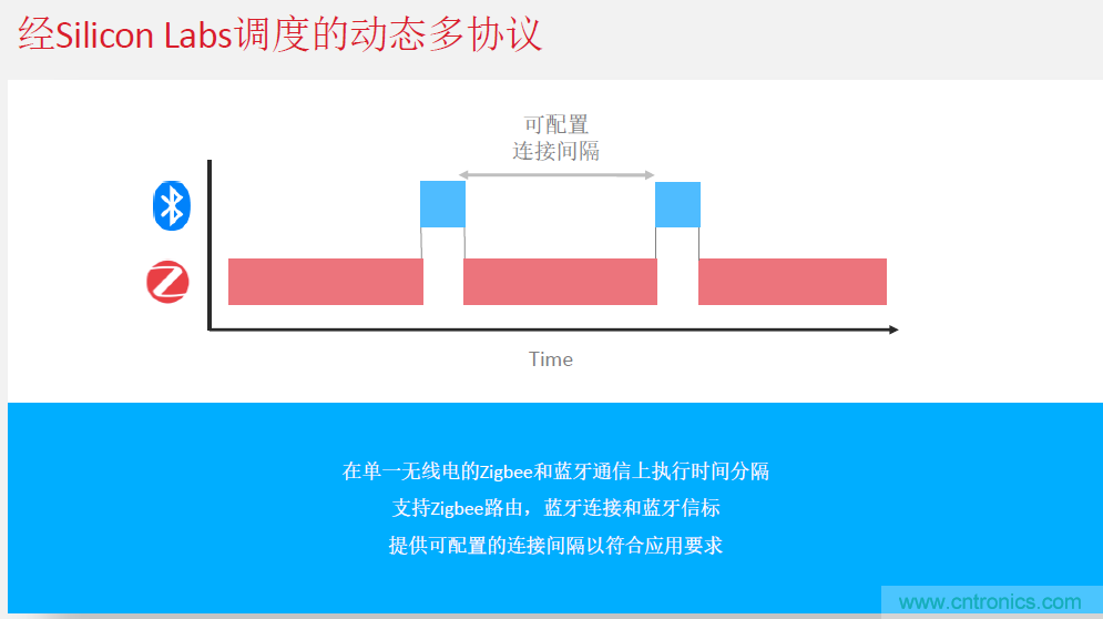 Silicon Labs在芯片設(shè)計(jì)時(shí),就提出了動(dòng)態(tài)多協(xié)議的做法。即:在單一無(wú)線電的Zigbee和藍(lán)牙通信上執(zhí)行時(shí)間分隔,支持Zigbee路由、藍(lán)牙連接和藍(lán)牙信標(biāo)。為工程師提供可配置的連接間隔,以符合應(yīng)用要求。陳雄基表示,目前這種做法據(jù)他所知Silicon Labs是業(yè)界唯一已經(jīng)在技術(shù)上實(shí)現(xiàn)的公司。