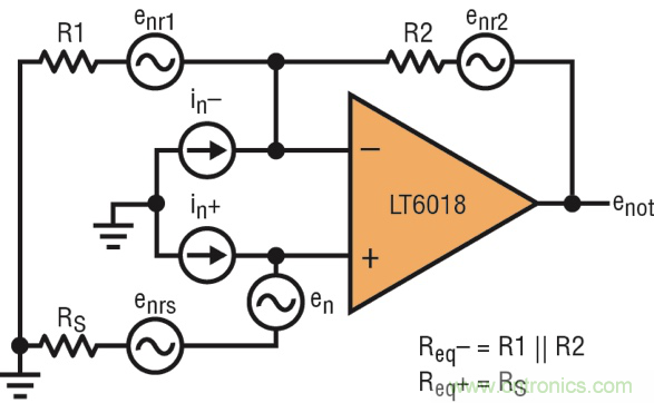 首先,把電阻器看作是噪聲源。電阻器天生具有與電阻值的平方根成比例的噪聲。在 300K 的溫度下,任何電阻器的電壓噪聲密度為 en = 0.13√R nV/√Hz。該噪聲也可被視為一種諾頓 (Norton) 等效電流噪聲:in = en/R = 0.13/√R nA/√Hz。因此,電阻器具有一個(gè) 17 zeptoWatts 的噪聲功率。優(yōu)良的運(yùn)放將具有低于該值的噪聲功率。例如:LT6018 的噪聲功率 (在 1kHz 頻率下測量) 約為 1 zeptoWatt。