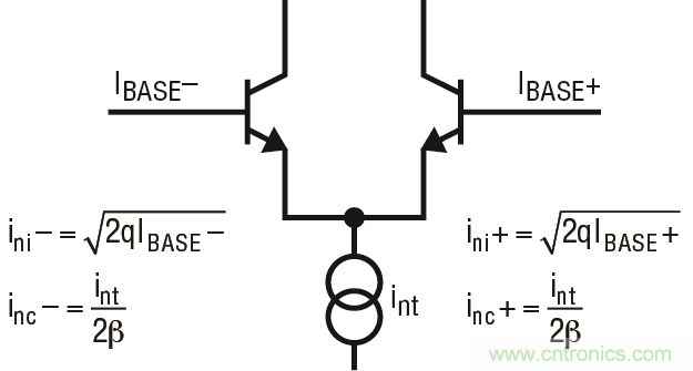 就寬帶噪聲而論,兩個(gè)輸入晶體管均具有與其基極相關(guān)聯(lián)的點(diǎn)噪聲 (ini- 和 ini+),這些點(diǎn)噪聲是不相干的。來自位于輸入對(duì)尾部之電流源的噪聲 (int) 還產(chǎn)生了在兩個(gè)輸入之間劃分的相干噪聲 (在每個(gè)輸入中為 int/2β)。如果兩個(gè)輸入上承載的電阻相等,則每個(gè)輸入上的相干電壓噪聲也是相等的,并且抵消 (根據(jù)放大器的共模抑制能力),因而留下的主要是不相干噪聲。這在產(chǎn)品手冊(cè)中被列為平衡電流噪聲。如果兩個(gè)輸入上的電阻極大地失配,則相干和不相干噪聲分量保留,而且電壓噪聲以平方根之和相加。這在有些產(chǎn)品手冊(cè)中列為不平衡噪聲電流。