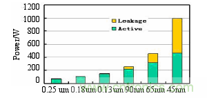 在深亞微米工藝下,電路的功耗主要是跳變功耗,短路功耗和漏電功耗可以忽略不計。但隨著工藝發(fā)展到納米級,漏電功耗在整個功耗中的比例將顯著提高(如下圖所示)。