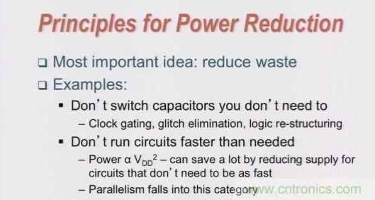 •降低電壓:電壓受頻率影響,可以通過降低頻率來降低所需電壓。當頻率降低,電路開關速度降低,就能有更多時間去進行充電,因此所需充電電壓就能降低(電壓越大充電速度越快)。同時,可通過流水線分割組合邏輯。若同時保持頻率不變,電路能有更多時間去進行充電,從而降低所需充電電壓。