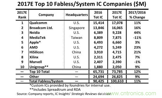 目前看來,紫光展銳現(xiàn)在已經(jīng)是一個(gè)擁有4500員工、年?duì)I收超過100億元、中國第一、世界第三(僅次于高通和聯(lián)發(fā)科)的芯片設(shè)計(jì)公司。在ICinsights最新公布的數(shù)據(jù)里,紫光展銳也是排名世界第九的無晶圓廠,這是國內(nèi)除海思外,唯一入選的企業(yè)。多方面的數(shù)據(jù)證明,紫光展銳已經(jīng)在芯片世界擁有了不小的名頭。