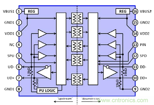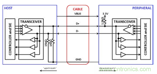 2. 它必須管理USB電纜上的雙向通信,確保其收發(fā)器在適當(dāng)?shù)臅r(shí)候進(jìn)行發(fā)送和接收,并精確重現(xiàn)所有驅(qū)動(dòng)和空閑狀態(tài)。若要精確重現(xiàn)空閑狀態(tài),它必須在其上游側(cè)配置上拉電阻,以模擬連接下游外設(shè)的上拉電阻狀態(tài)。它在下游側(cè)也需配置下拉電阻。必須監(jiān)控總線上表示總線空閑、分組開(kāi)始和分組結(jié)束的信號(hào),以便正確響應(yīng)這些狀況。