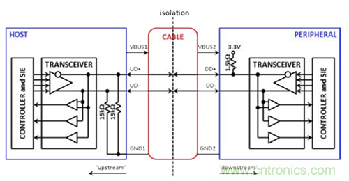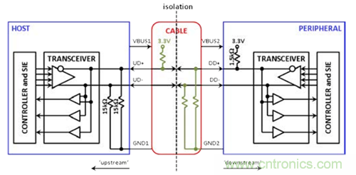 一種可能的隔離方法如圖2a所示。圖中,虛線表示隔離在理論上將USB電纜分割。D+和D–的狀態(tài)信息可以跨越隔離柵,但電流不能。GND1節(jié)點(diǎn)(上游的接地基準(zhǔn))現(xiàn)在與GND2節(jié)點(diǎn)(下游的接地基準(zhǔn))相互分離。不幸的是,隔離使主機(jī)無(wú)法“看到”下游的上拉電阻,而外設(shè)無(wú)法“看到”上游的下拉電阻。因此,需要使用一些額外的電阻,如圖2b所示,以便跨越隔離模仿相應(yīng)連接。在這個(gè)“透明”概念中,主機(jī)與外設(shè)之間的通信方式和圖1中的非隔離式連接十分類(lèi)似。透明的USB