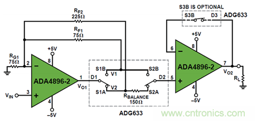 圖 1. 利用 ADA4896-2 和 ADG633 構(gòu)建低噪聲增益可選放大器來驅(qū)動低阻負(fù)載