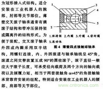 球軸承是機(jī)器人和機(jī)械手機(jī)構(gòu)中最常用的軸承。它能承受徑向和軸向載荷,摩擦較小。其機(jī)器人專用軸承四點(diǎn)接觸式設(shè)計(jì)以及高精度加工。這種軸承比同等軸徑的常規(guī)中系列四點(diǎn)接觸軸承輕25倍。它的內(nèi)圈(或外圈)由兩個(gè)半圈精確拼配而成,而其整體外圍(或內(nèi)圈) 的溝曲率半徑較小,使鋼球與內(nèi)、外圈在四個(gè)“點(diǎn)”上接觸。既加大了徑向負(fù)荷能力,又能以緊湊的尺寸承受很的兩個(gè)方向的軸向負(fù)荷,并且有很好的兩個(gè)方向的軸向限位能力,因?yàn)樗妮S向游隙相對(duì)較小。而其接觸角 (一般取為35)又較大。工業(yè)機(jī)器人專用薄壁四點(diǎn)接觸球軸承通常有帶密封圈和不帶密封圈的結(jié)構(gòu)形式(見(jiàn)圖4)。其主要由內(nèi)圈、外 圍、保持架、鋼球或非接觸式密封圈組成。內(nèi)、外圈均為整體結(jié)構(gòu)。鋼球與內(nèi)、外因溝道呈四點(diǎn)接觸.保持架為冠形插入式結(jié)構(gòu)。