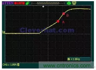 從圖中可以看到,在A點(diǎn)以下,當(dāng)采樣電壓小于1.8V(電流小于3.6A),電流隨時(shí)間平穩(wěn)上升。過A點(diǎn)后電流上升速度明顯加快,因此該電感的飽和電流與為3.6A。