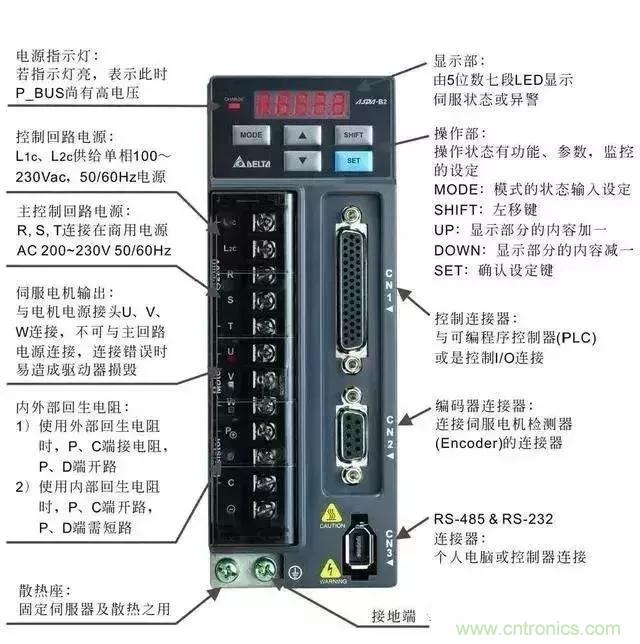 伺服驅(qū)動器主要有控制回路電源、主控制回路電源、伺服輸出電源、控制器輸入CN1、編碼器接口CN2、連接起CN3??刂苹芈冯娫词菃蜗郃C電源,輸入電源可單相、三相,但是必須是220v,就是說三相輸入時,咱們的三相電源必須經(jīng)過變壓器變壓才能接,對于功率較小的驅(qū)動器,可單相直接驅(qū)動,單相接法必須接R、S端子。伺服電機輸出U、V、W切記千萬不能與主電路電源連接,有可能燒毀驅(qū)動器。CN1端口主要用于上位機控制器的連接,提供輸入、輸出、編碼器ABZ三相輸出、各種監(jiān)控信號的模擬量輸出。