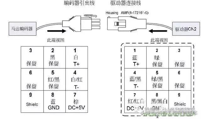 從上圖看出九個端子我們只使用了5個,一個屏蔽線、電源線兩根、串行通訊信號(+-)兩根,與我們普通的編碼器接線差不多。