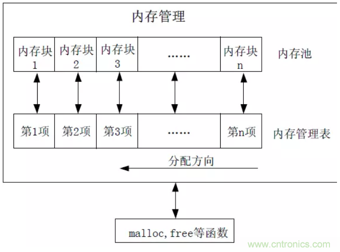 注意表中的分配方向,從頂?shù)降住C恳豁棇粋€內存塊。里面的數(shù)值代表了內存池的狀態(tài):如果為0,表示該內存沒有被分配;如果非0,那么數(shù)值的大小就表示了該塊內存被連續(xù)占用的內存數(shù)。