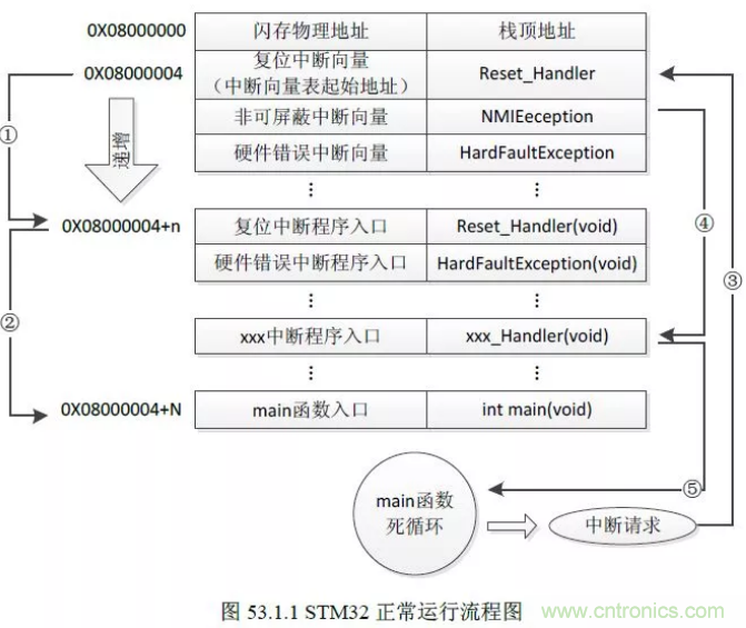 上圖表示STM32正常運行的流程圖,可以看到上電復位后系統(tǒng)從0x80000004處開始運行程序,這里放置的是復位中斷向量,然后跳轉至復位中斷程序入口后再跳轉至main函數(shù)運行用戶的程序。