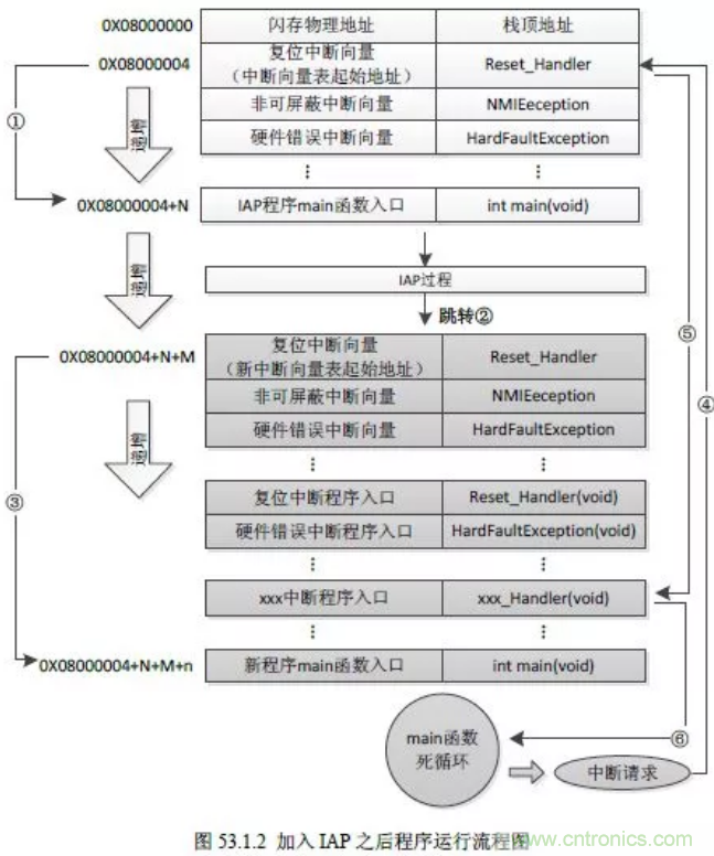 后面的過程和STM32正常運行一樣,如果出現(xiàn)中斷請求,還是跳轉到A區(qū)域中的中斷向量表中,然后再跳轉到B區(qū)域的中斷服務入口。