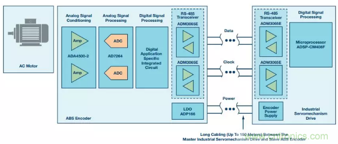 圖1顯示了一個電機(jī)控制信號鏈,其利用RS-485收發(fā)器和微處理器連接絕對編碼器(ABS編碼器)從機(jī)和工業(yè)伺服驅(qū)動器主機(jī),以實現(xiàn)對交流電機(jī)的閉環(huán)控制。
