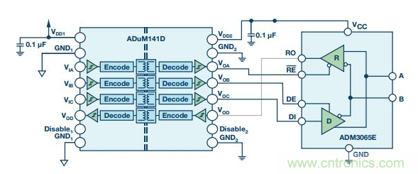 RS-485信號傳輸是平衡的差分式傳輸,本身便能抗干擾。系統(tǒng)噪聲均等地耦合到RS-485雙絞線電纜中的每條導(dǎo)線。一個信號的發(fā)射與另一個信號相反,耦合到RS-485總線的電磁場彼此抵消。這降低了系統(tǒng)的電磁干擾(EMI)。此外,ADM3065E增強(qiáng)的2.1 V驅(qū)動強(qiáng)度支持在通信中實現(xiàn)更高的信噪比(SNR)。給ADM3065E增加信號隔離可利用ADuM141D 輕松實現(xiàn)。