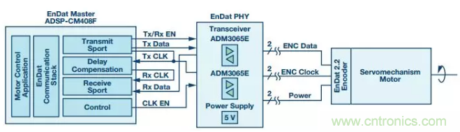 伺服驅(qū)動器和ABS編碼器之間的RS-485通信鏈路通常要求最高達(dá) 16 MHz的高數(shù)據(jù)速率和低傳播延遲時序規(guī)格。RS-485線纜延伸長度最大值通常是50米,但有時候也可能長達(dá)150米。對數(shù)據(jù)通信而言,電機(jī)控制編碼器應(yīng)用是具有挑戰(zhàn)性的環(huán)境,因為電氣噪聲和長電纜會影響RS-485信號傳輸?shù)耐暾?。本文重點闡述電機(jī)控制應(yīng)用采用ADI50 Mbps (25 MHz) ADM3065E RS-485收發(fā)器和ADSP-CM40x混合信號控制處理器的主要好處。