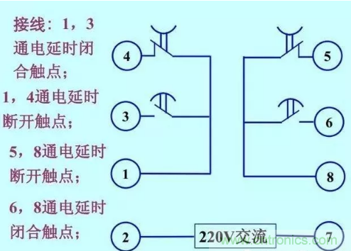 1-3腳為通電延時閉合觸點,接通電源,給了信號之后線圈得電,等到設(shè)置時間到達(dá)以后,觸點閉合;