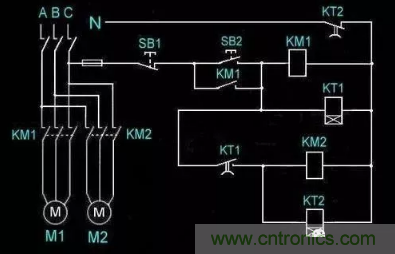 各個引腳的含義我們已經(jīng)搞清楚了,下面就可以根據(jù)控制原因進(jìn)行接線,我們以下圖為例,在電路中加入KT通電延時時間繼電器,當(dāng)按下啟動按鈕SB2線圈KT1、KM1得電交流接觸器KM1吸合,電動機(jī)M1轉(zhuǎn)動,延時閉合開關(guān)KT1到達(dá)時間吸合,KM2、KT2得電,交流接觸器KM2得電吸合,電動機(jī)M2轉(zhuǎn)動,延時斷開開關(guān)KT2在到達(dá)時間以后斷開,整個控制回路斷開,所有電機(jī)停止轉(zhuǎn)動;