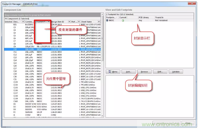 3、封裝庫管理器可以對一個或多個器件進(jìn)行封裝,進(jìn)行添加、刪除、編輯等操作,同時可以通過Comment值篩選,局部或全局更改(或添加)同類型器件封裝名,如圖1-3所示。