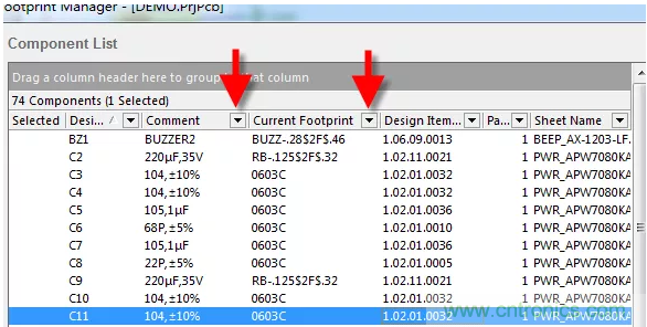2、如圖1-2可見,原理圖中涉及到的元器件都在“Component List”里面進(jìn)行了顯示,點擊“Current Footprint”,可對同類型的封裝進(jìn)行集中排序,方便我們設(shè)計者按照封裝庫類去檢查封裝的完整性,若某個器件沒有添加封裝,會優(yōu)先在前排顯示處理。