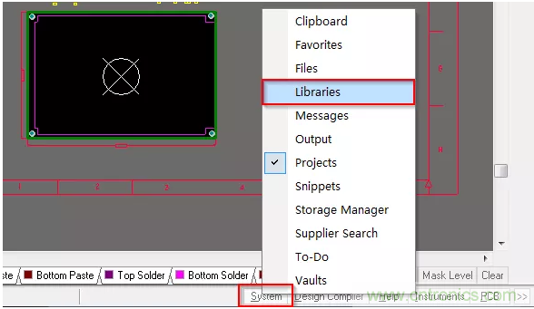 1、首先,指定庫路徑前,要刪除PCB中已關(guān)聯(lián)的系統(tǒng)庫,打開PCB界面,單擊右下角“System”菜單中的“Libraries”按鈕,可調(diào)出如圖1-5所示庫編輯頁面。