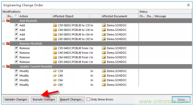 4、對封裝進(jìn)行完編輯或添加等操作之后,執(zhí)行右下角的“Accept Changes(Create ECO)”命令,對更新內(nèi)容點擊“Execute Changes”更新到原理圖當(dāng)中,如圖1-4。