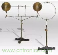 赫茲將兩個(gè)大的銅球作為電容,并通過(guò)銅棒連接在相隔很近的兩個(gè)小銅球上。兩個(gè)小銅球連出兩根
