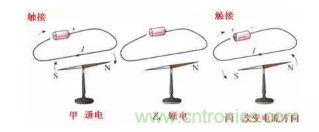 上圖展示了電流的磁效應(yīng),導(dǎo)線通電之后,周圍產(chǎn)生的磁場(chǎng)使磁針發(fā)生了偏轉(zhuǎn)。