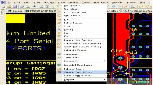 有時我們在鋪完銅之后還需要去刪除一些碎銅,現(xiàn)在可以很方便的實現(xiàn),點擊 Place—Polygon Pour Cutout