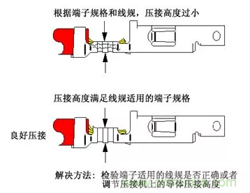 解決壓接高度過小或過大方法很簡單:可以嘗試調(diào)節(jié)壓接機(jī)上的導(dǎo)體壓接高度。在首次使用壓接機(jī)進(jìn)行工作時(shí),使用游標(biāo)卡尺或千分尺檢驗(yàn)壓接高度在規(guī)定范圍內(nèi),并且在工作過程中應(yīng)按照要求的頻度重新檢查,以保持正確的壓接高度。