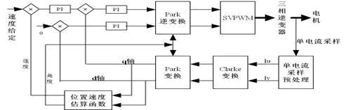 電機(jī)通過單電流采樣得到兩個(gè)采樣電流值,通過電流識(shí)別方法,計(jì)算出三相電流,利用Clarke和Park變換將電流映射到d、q坐標(biāo)系下,估算出角度和速度值,通過結(jié)合了積分分離的PI控制算法,完成對(duì)電機(jī)的反饋控制,然后經(jīng)過Park逆變換,生成了新的SVPWM波,完成一次循環(huán)。這里用到的位置、速度估算函數(shù)由于篇幅所限,將另做描述。