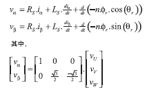 最新無傳感器算法基于如圖1所示的永磁同步電機的簡化模型,電機繞組反電勢波形為轉子角度的正弦函數(shù),因而能夠用于測量轉子角度。通過測量外加定子電壓時流入定子線圈的電流可以計算反電勢。為簡化數(shù)學運算,可以利用 Clarke變換將三相電路變換為兩相等效模型,這樣就可以用轉子角度的正弦和余弦函數(shù)表示反電勢,其等效電路可以由以下方程描述: