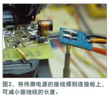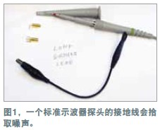 在測量電源軌的紋波時,必須盡量減小噪聲,因為紋波幅度可能很小。示波器探頭是基本的測量工具,但它們可能引入噪聲與誤差。地線(如與標準示波器探頭連接的那根線)可能增加一些不會出現在示波器軌跡上的電路噪聲。線路環(huán)就像一根天線,會提取周圍的雜散磁場。環(huán)路面積越大,提取的噪聲就越多。為證明這個理論,可將示波器地線連接到探頭尖端,然后到處移動。示波器會隨著地線的移動而顯示出噪聲的增減。用一個示波器探頭及其地線和插座可以做一個簡單的連接板(圖1)。