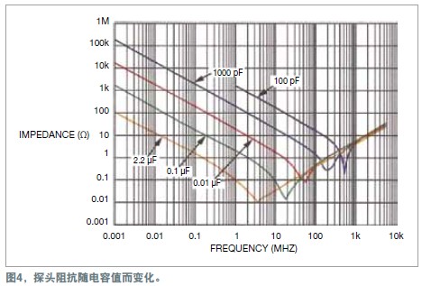 電容應采用多層堆疊式的瓷片電容,因為它能更好地去耦高頻噪聲。電解電容、紙電容以及塑料薄膜電容都有兩片金屬箔。金屬箔由一片電介質分隔開,這三部分構成一個卷狀物。這種結構有自身的電感;因此,當頻率高于數兆赫茲時,它更類似于一只電感,而不是電容。圖4顯示了各種堆疊式瓷片電容值對電源的阻抗。