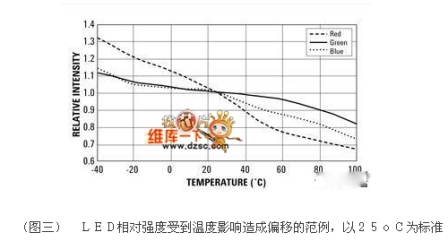 這類LED光源的簡(jiǎn)單開迴路架構(gòu)方式有個(gè)潛在的問題,由于LED的光學(xué)特性會(huì)受到運(yùn)作條件的影響,因此組合后的RGB光源輸出的亮度以及色度都會(huì)變化。同時(shí),每顆LED元件也不盡相同,因此造成RGB光源的輸出產(chǎn)生更多變化,(圖二)與(圖三)就描述了幾個(gè)LED變動(dòng)的范例。