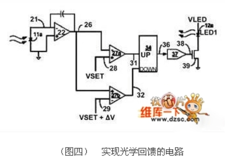 在(圖四)中,標(biāo)記為22的積分電路可以輸出一個(gè)受到光二極管(11a)上光量控制的電壓,這個(gè)電壓與VSET比較,比較器的輸出能控制計(jì)數(shù)器數(shù)值的增加或減少,計(jì)數(shù)器的輸出則是用來推動(dòng)一個(gè)數(shù)字模擬轉(zhuǎn)換器(37),進(jìn)而控制LED的驅(qū)動(dòng)電流。