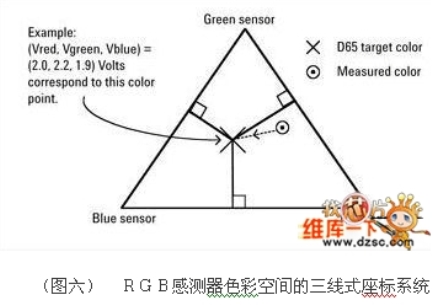 基本上來說,三色光感測(cè)器會(huì)產(chǎn)生一個(gè)三維色彩規(guī)格系統(tǒng),因此稱為RGB感測(cè)器色彩空間,這個(gè)系統(tǒng)可以讓特定色彩由感測(cè)器的輸出電壓來指定,例如具備特定亮度的D65白光可以記錄為:(Vred,?。郑纾颍澹澹?, Vblue)=(2.0, 2.2, 1.9)volts。